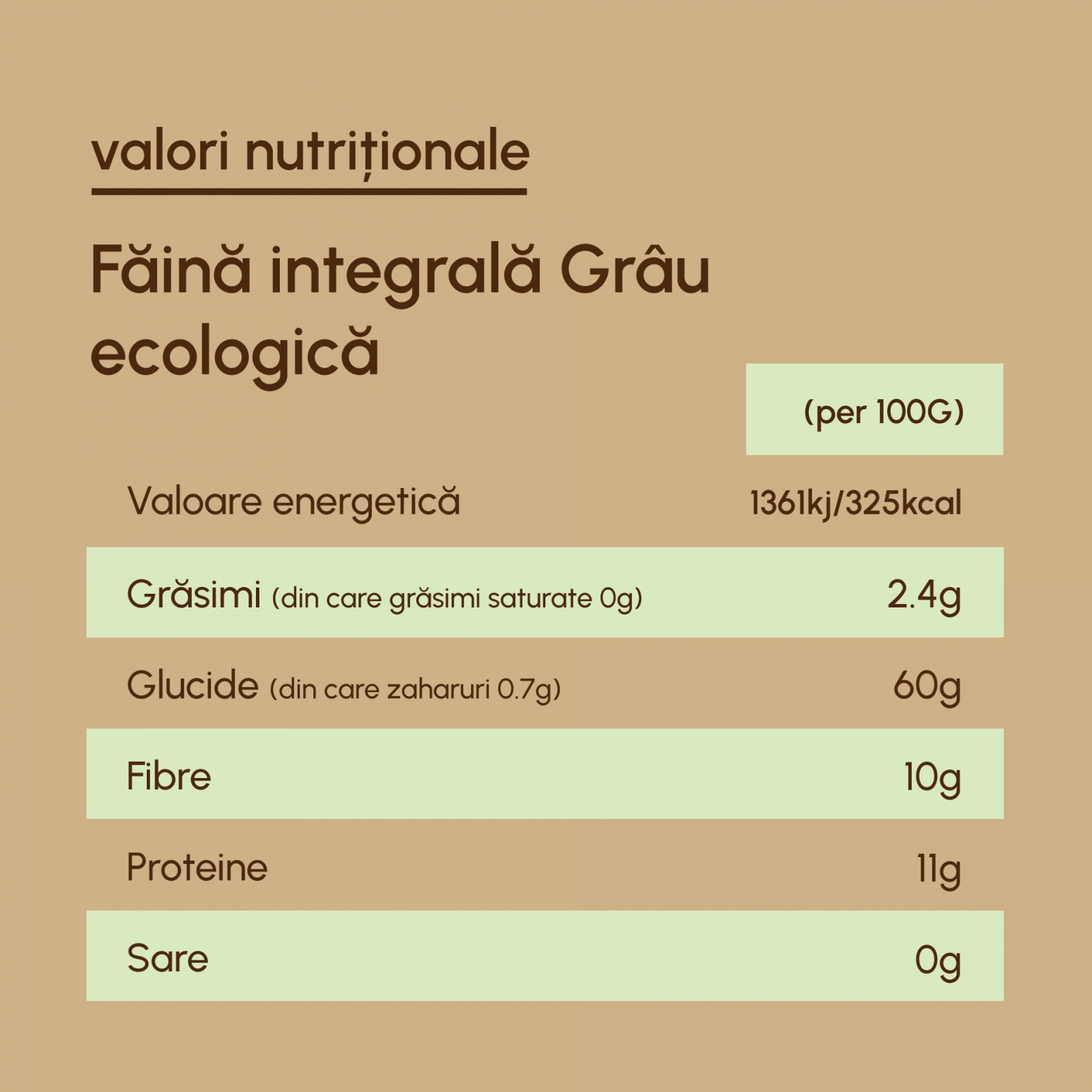 Boabele de grâu sunt atent selecționate și cultivate fără pesticide, fiind măcinate la temperaturi scăzute pentru a păstra toți nutrienții esențiali. Făina noastră oferă un gust autentic și o textură perfectă pentru pâine, prăjituri și alte produse de panificație.