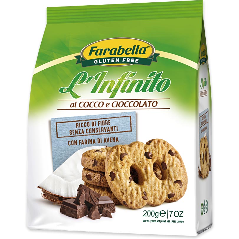 Infinito cu cocos și ciocolată – Biscuiți fără gluten Farabella sunt biscuiți dulci și crocanți, cu arome naturale, ideali în orice moment al zilei.