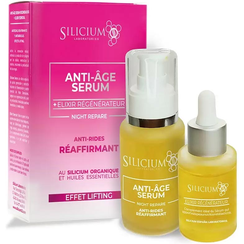 Silicium Anti-age – Ser antirid și Elixir regenerator este un set dedicat îmbunătățirii fermității pielii, cu efect de lifting, cu siliciu organic ca ingredient activ, cu extracte și uleiuri naturale, potrivit pentru toate tipurile de ten.